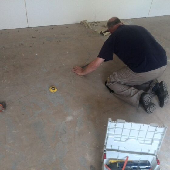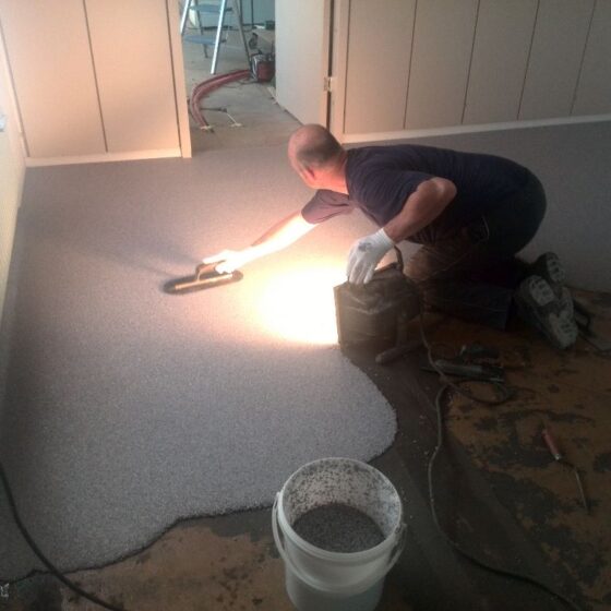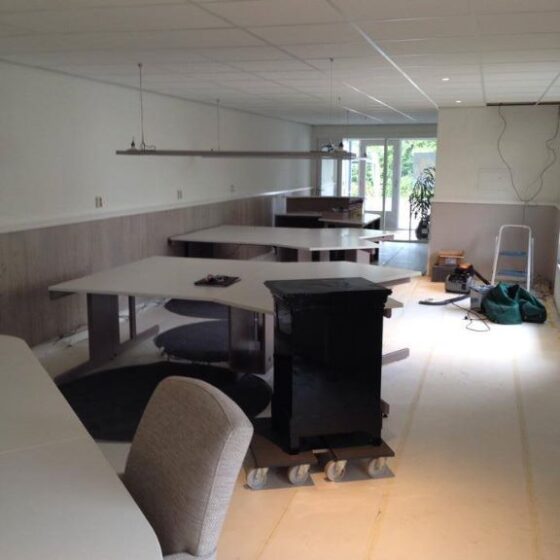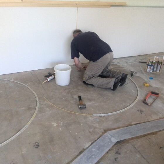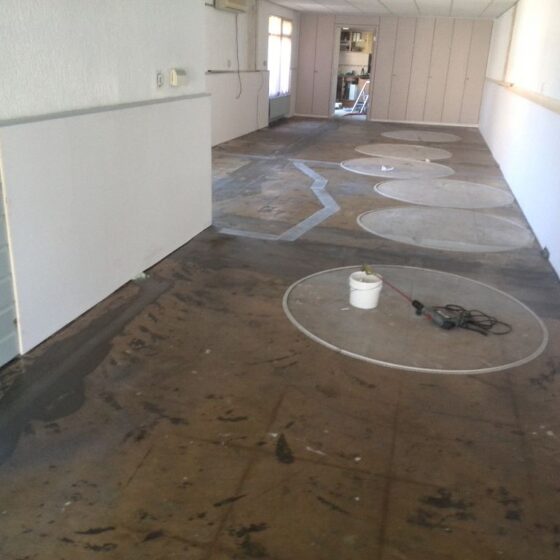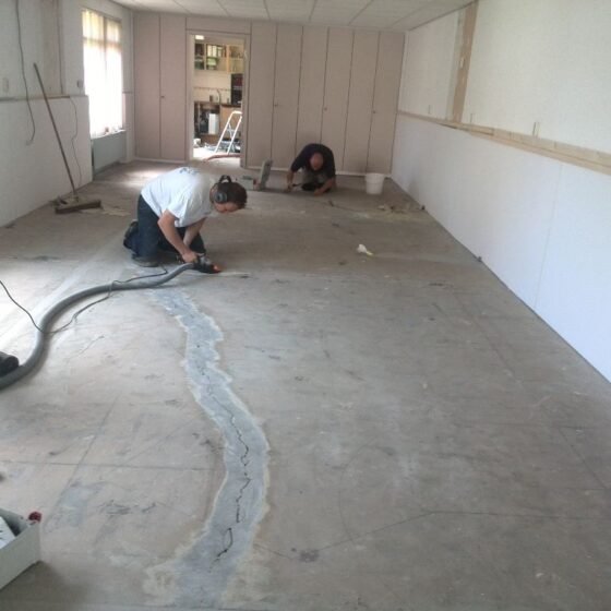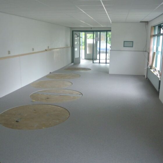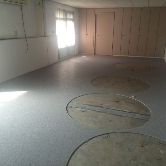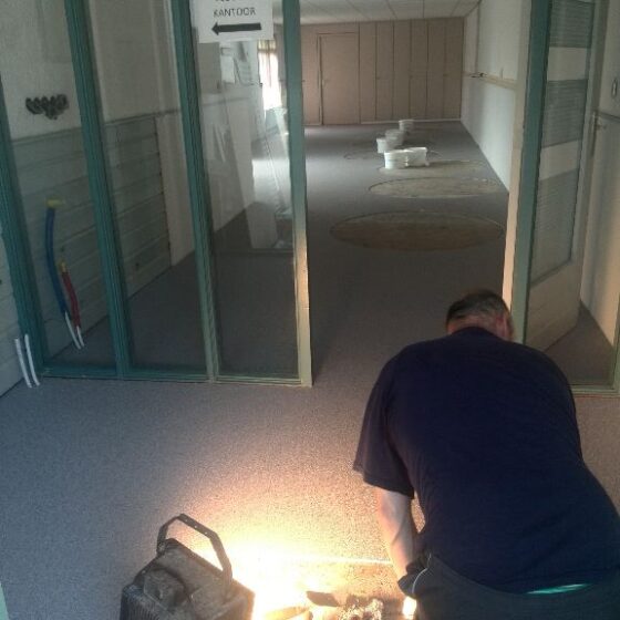 Bij deze grindvloer zijn verschillende uitsparingen gemaakt waar later tapijt in werd gelegd. Hierop zijn bureaus geplaatst, zodat iedereen zijn eigen werkplek heeft. Opdrachtgever heeft de vloer goed afgedekt met stucloper tijdens het afbouwen van wanden en het plaatsen van het meubilair.